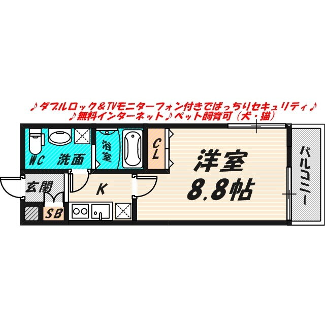 | 間取り | 1K(洋8.8 K) | 築年月(築年数) | 2019年12月(築6年1ヶ月) |