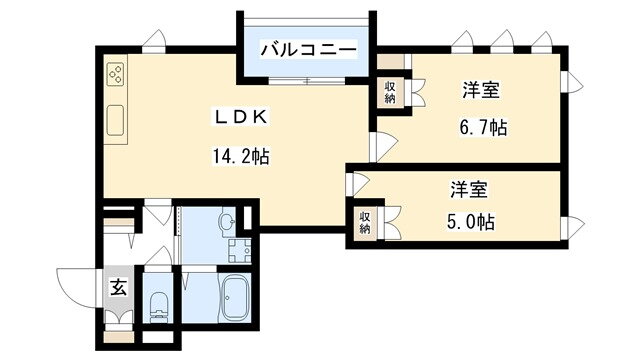 | 間取り | 2LDK(洋6.7 洋5 LDK14.2) | 築年月(築年数) | 2023年3月(築2年10ヶ月) |