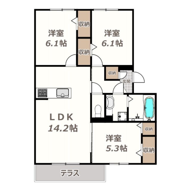 | 間取り | 3LDK(洋6.1 洋6.1 洋5.3 LDK14.2) | 築年月(築年数) | 2023年10月(築2年2ヶ月) |