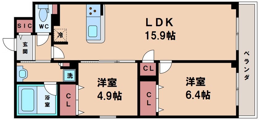 | 間取り | 2LDK(洋6.4 洋4.9 LDK15.9) | 築年月(築年数) | 2023年9月(築2年4ヶ月) |