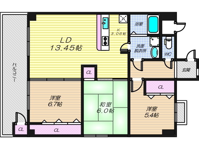 | 間取り | 3LDK(和6.0 洋6.7 洋5.4 LDK13.4) | 築年月(築年数) | 1992年2月(築33年11ヶ月) |