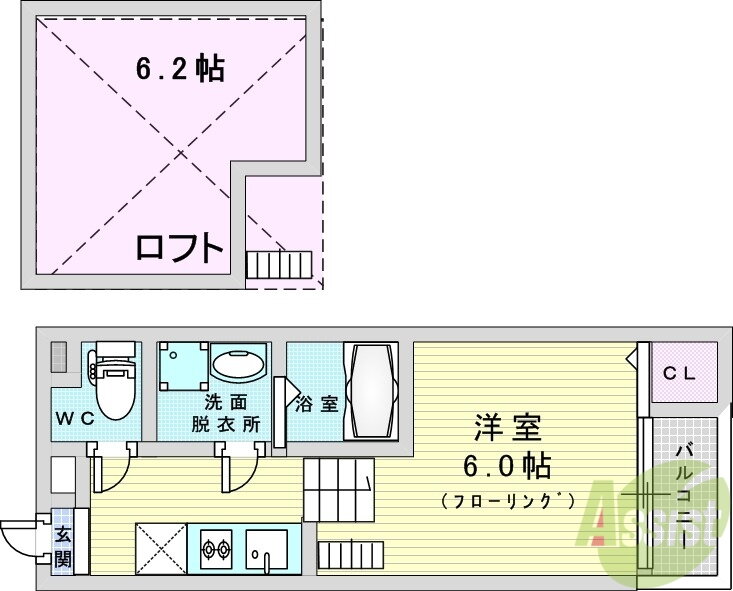 | 設備 | 冷房・暖房・エアコン・ロフト・オートロック・バルコニー・バス・トイレ別・トイレ・収納スペース・洗濯機置場・洗面所・BS端子・フローリング・ガスコンロ可・シャンプードレッサ・温水洗浄便座・システムキッチン・モニタ付インターホン・宅配BOX・駐輪場・クローゼット・CS・プロパンガス・浴トイレ別・洗面所独立・コンロ2口以上・室内洗濯機置き場 | ||||