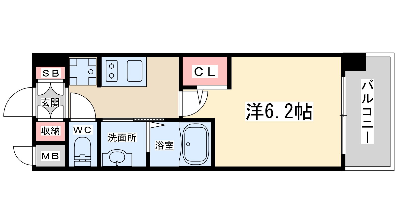 | 間取り | 1K(洋6.2) | 築年月(築年数) | 2019年8月(築6年5ヶ月) |