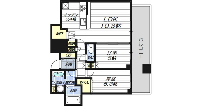 | 間取り | 2LDK(洋6.3 洋5.0 LDK10.3 納戸 1.3) | 築年月(築年数) | 2022年3月(築3年9ヶ月) |