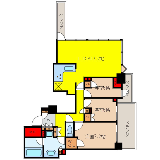 3LDK(洋7.2 洋5 洋5 LDK17.2) |