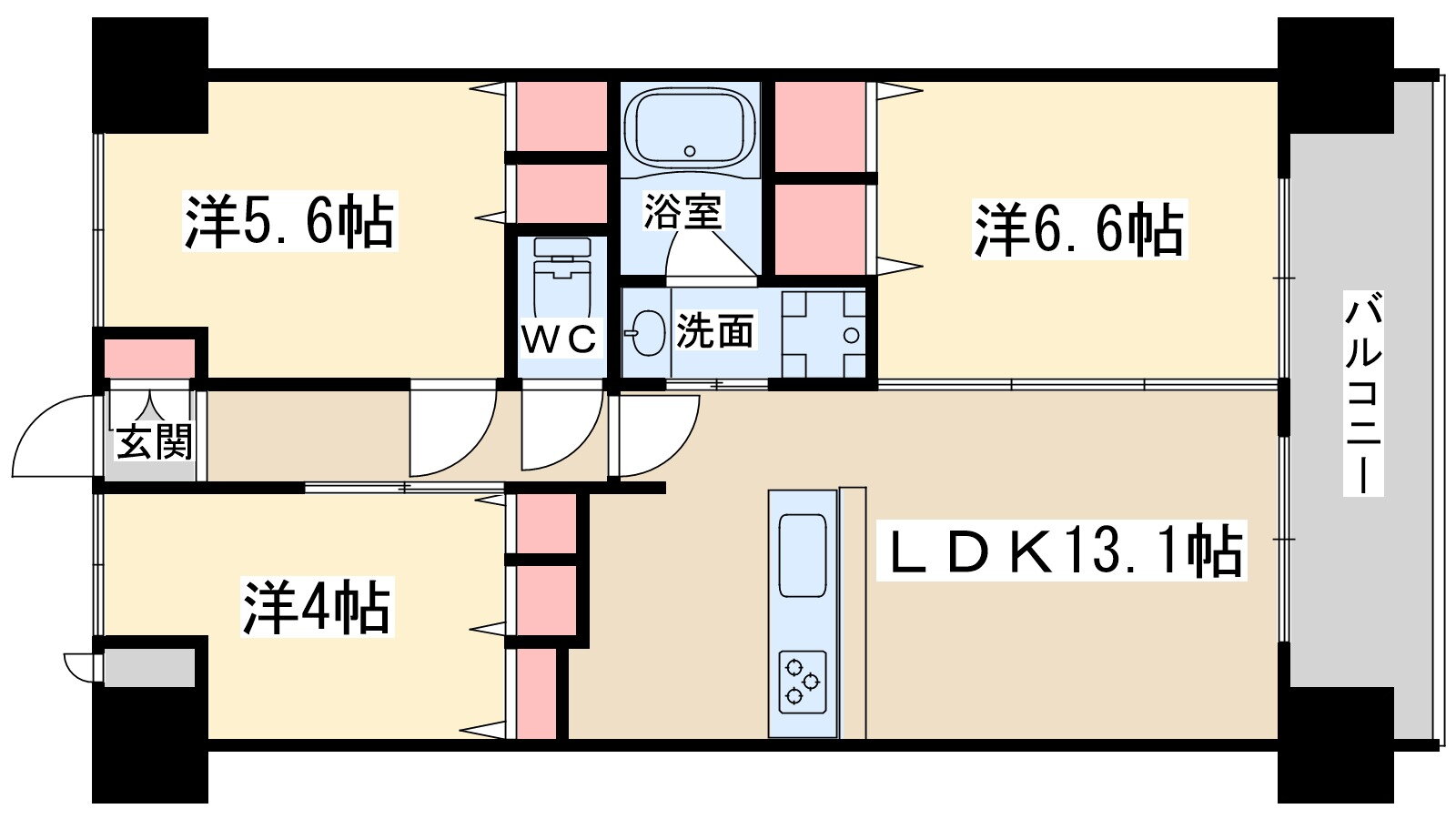 | 間取り | 3LDK(洋6.6 洋5.6 洋4.0 LDK13.1) | 築年月(築年数) | 2025年11月(築1年未満) |