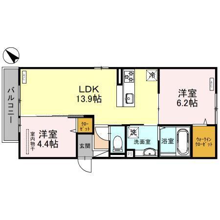 | 間取り | 2LDK(洋6.2 洋4.4 LDK13.9) | 築年月(築年数) | 2024年8月(築1年5ヶ月) |