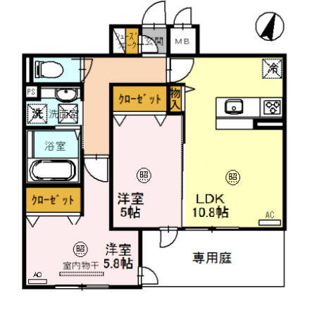 | 間取り | 2LDK(洋5.8 洋5.0 LDK10.8) | 築年月(築年数) | 2020年4月(築5年9ヶ月) |
