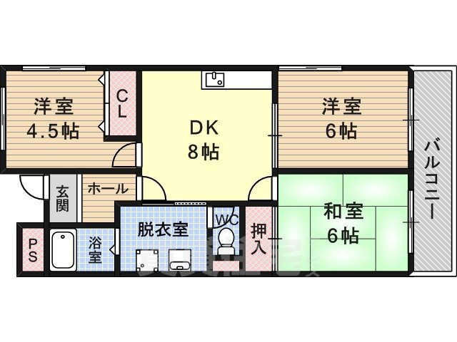 | 間取り | 3DK(和6.00 洋6.00 洋4.50 DK8.00) | 築年月(築年数) | 1990年2月(築35年11ヶ月) |