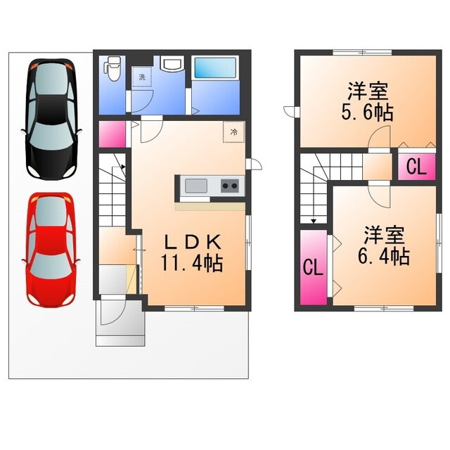 2LDK(洋6.4 洋5.6 LDK11.4) |