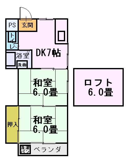 | 間取り | 2DK(和6 和4.5 ロフト 6) | 築年月(築年数) | 1989年2月(築36年11ヶ月) |