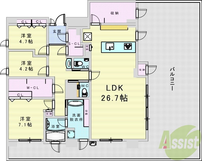 | 間取り | 3LDK(洋7.1 洋4.7 洋4.2 LDK26.7) | 築年月(築年数) | 2023年11月(築2年2ヶ月) |