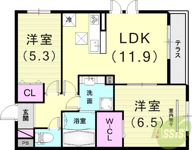 | 間取り | 2LDK(洋6.5 洋5.3 LDK11.9) | 築年月(築年数) | 2021年3月(築4年10ヶ月) |