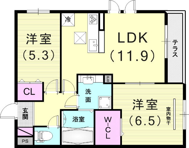 | 間取り | 2LDK(洋6.5 洋5.3 LDK11.9) | 築年月(築年数) | 2021年3月(築4年10ヶ月) |