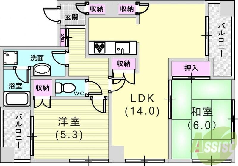| 間取り | 2LDK(和6 洋5.3 LDK14) | 築年月(築年数) | 1993年2月(築32年11ヶ月) |