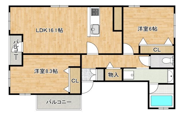| 間取り | 2LDK(洋8.3 洋6.0 LDK16.1) | 築年月(築年数) | 2024年3月(築1年10ヶ月) |
