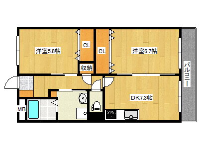 | 間取り | 2DK(洋6.7 洋5.8 DK7.3) | 築年月(築年数) | 2001年2月(築24年11ヶ月) |