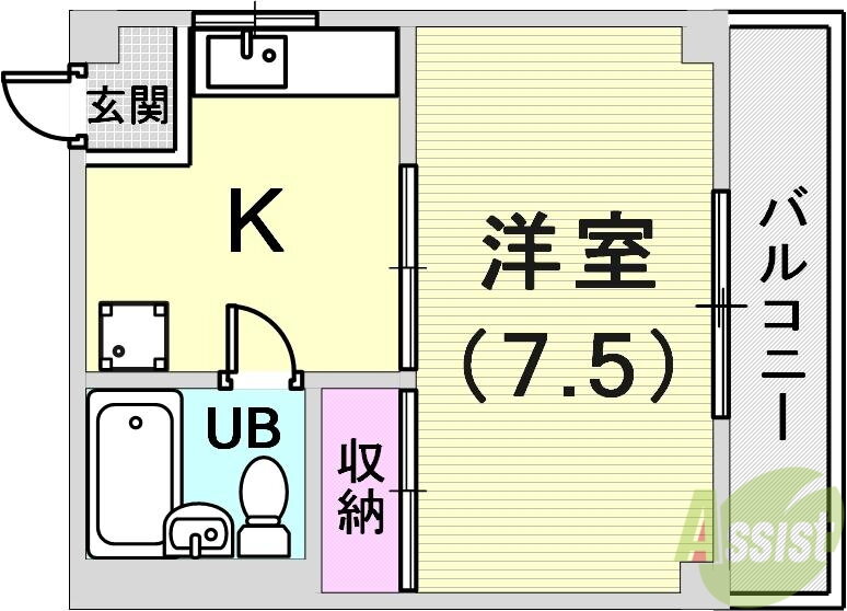 | 間取り | 1K(洋7.5 K3.5) | 築年月(築年数) | 1986年2月(築39年11ヶ月) |
