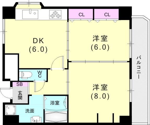| 間取り | 2DK(洋8.0 洋6.0 DK6.0) | 築年月(築年数) | 1998年6月(築27年7ヶ月) |