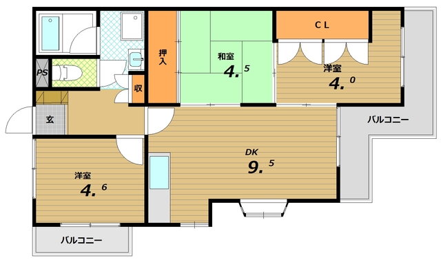 | 間取り | 3LDK(和4.5 洋4.5 洋4 LDK9.5) | 築年月(築年数) | 1985年9月(築40年4ヶ月) |