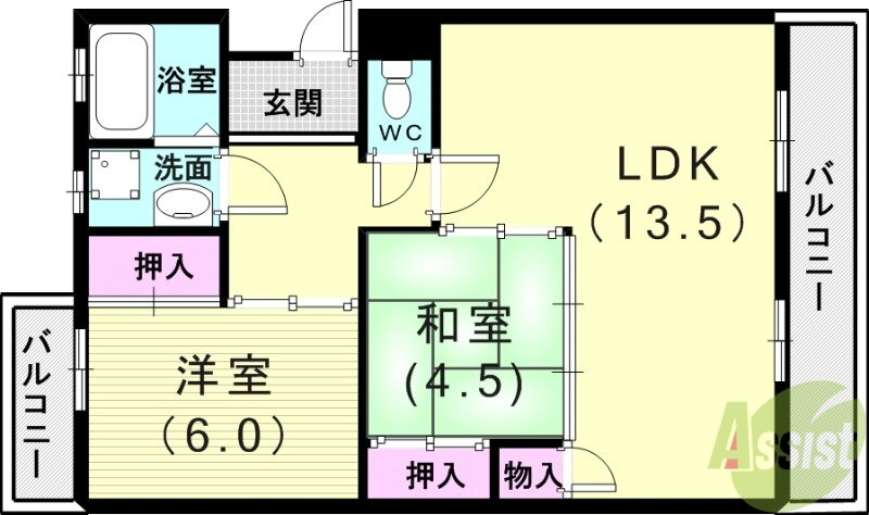 | 間取り | 2LDK(和4.5 洋6 LDK13.5) | 築年月(築年数) | 1981年3月(築44年10ヶ月) |