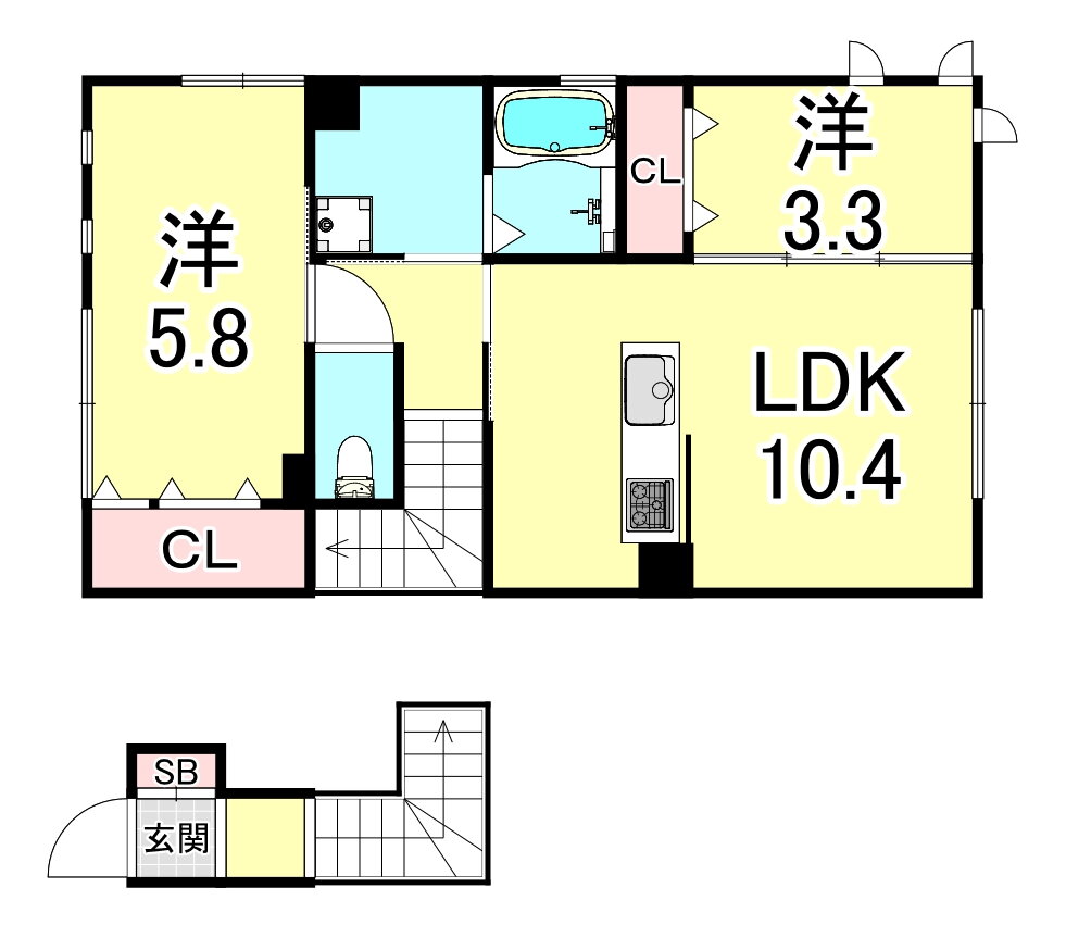 2LDK(洋5.8 洋3.3 LDK10.4) |