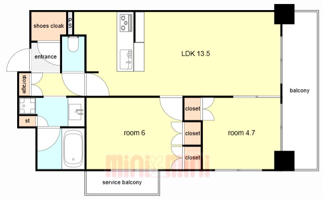 | 間取り | 2LDK(洋6 洋4.7 LDK13.5) | 築年月(築年数) | 2022年11月(築3年2ヶ月) |