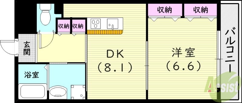 | 間取り | 1DK(洋6.6 DK8.1) | 築年月(築年数) | 2006年5月(築19年8ヶ月) |