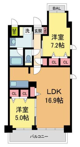| 間取り | 2LDK(洋7.2 洋5 LDK16.9) | 築年月(築年数) | 2018年2月(築7年10ヶ月) |