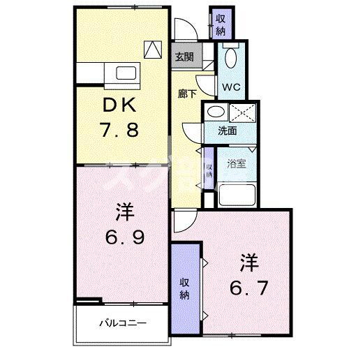 | 間取り | 2DK(洋6.9 洋6.7 DK7.8) | 築年月(築年数) | 2004年9月(築21年4ヶ月) |