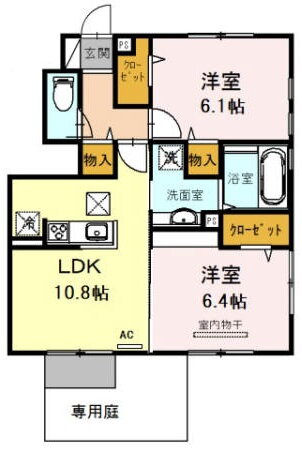 | 間取り | 2LDK(洋6.4 洋6.1 LDK10.8) | 築年月(築年数) | 2020年8月(築5年5ヶ月) |
