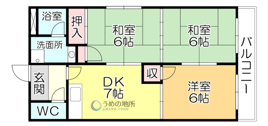 | 間取り | 3DK(和6 和6 洋6 DK7) | 築年月(築年数) | 1991年1月(築34年11ヶ月) |