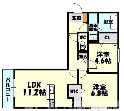 | 間取り | 2LDK(洋6.8 洋4.6 LDK11.2) | 築年月(築年数) | 2021年11月(築4年1ヶ月) |