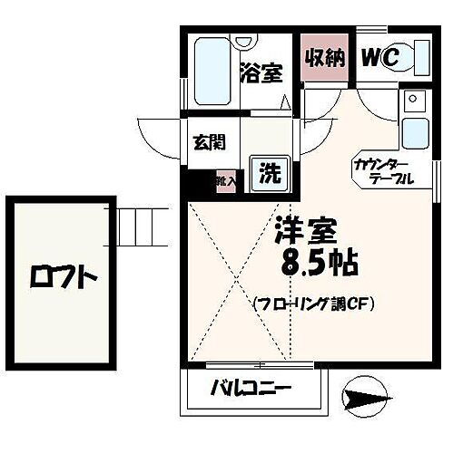 上水道・都市ガス・本下水・バス・トイレ別・シャワー・ガスコンロ可・システムキッチン・給湯・エアコン・ロフト・室内洗濯機置き場・BS端子・バルコニー・フローリング・駐輪場・カウンターキッチン・シューズボックス |