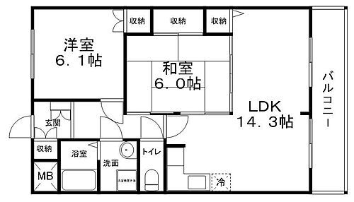 | 間取り | 2LDK(LDK 14.3 和 6 洋 6.1) | 築年月(築年数) | 1986年7月(築39年6ヶ月) |