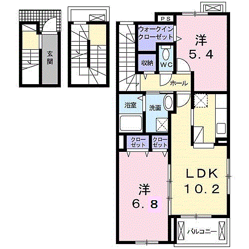 | 間取り | 2LDK(洋 6.8・5.4 LDK 10.2) | 築年月(築年数) | 2019年2月(築6年11ヶ月) |