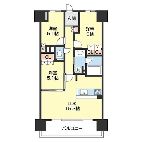 | 間取り | 3LDK(LDK 15.6 洋 6・5.1・4.5) | 築年月(築年数) | 2016年1月(築9年11ヶ月) |