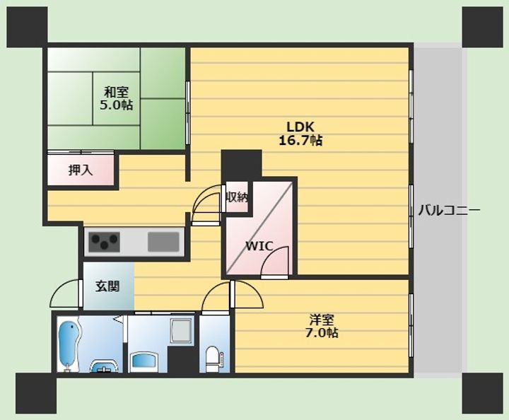 | 間取り | 2LDK(LDK 16.7帖、洋室 7.0帖、和室 5.0畳) | 築年月(築年数) | 2009年4月(築16年9ヶ月) |