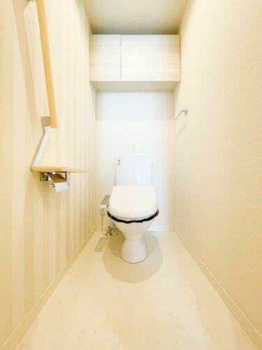 トイレ上部には収納スペースあり。備品の収納が可能です。