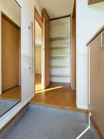 玄関には姿見鏡と下駄箱、棚収納の設置がございます。