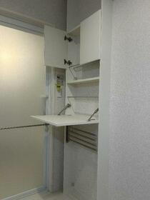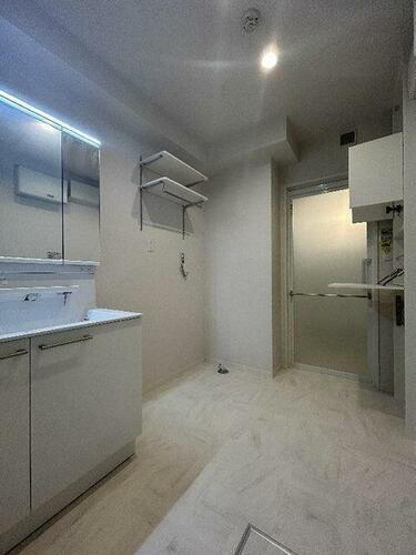 【洗面所】朝の忙しい時間にも便利な洗髪洗面化粧台となります。洗面所には収納棚があります◎