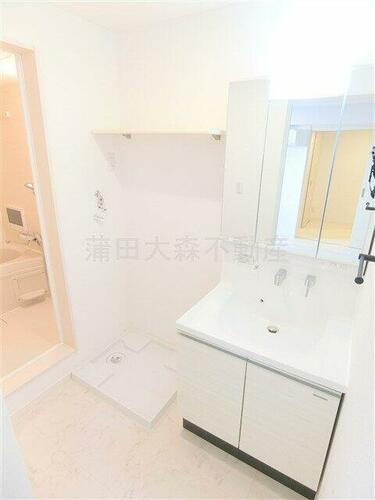 3面鏡の独立洗面台 棚付きの洗濯機置き場 洗面脱衣所