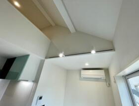 壁の濃いグレーのアクセントクロスと吹き抜けで高い天井。 ライトレールとダウンライト、エアコン設置済