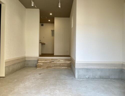 ガレージ奥には小上がりスペースがあり、デスクを置いて書斎として使ったり もう1つの趣味部屋として