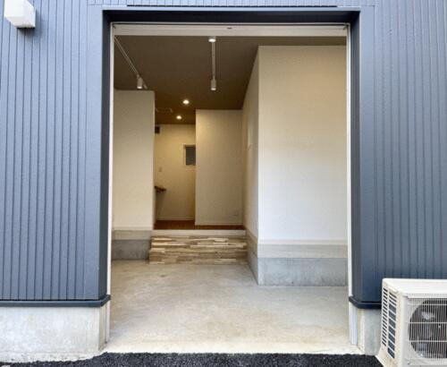 シャッター以外にも人が出入り出来る玄関ドアが建物側面にあります