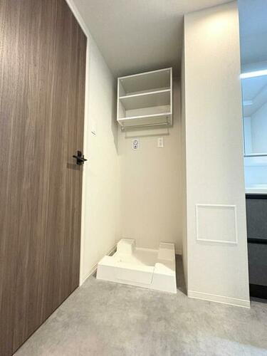 室内洗濯機置場、上部収納もありつかいやすいですね