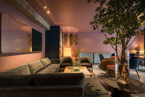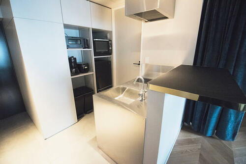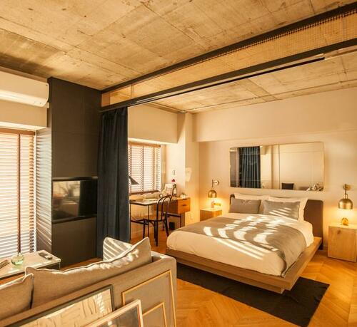 約16~18帖のLDK空間に、トイレ、洗面、シャワーなどの水回り設備を隠したシンプルな間取りのアパートメント。キッチン等の設備はデザイン重視のセレクトで、コンクリート現しのインダストリアルな雰囲気に合わせてオリジナルの空間作りをお楽しみいただけます。※ビジネス利用プランもご用意しております。