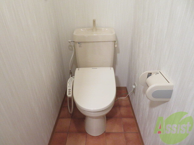 トイレにはウォシュレットが備え付け、清潔感あるクロスですね