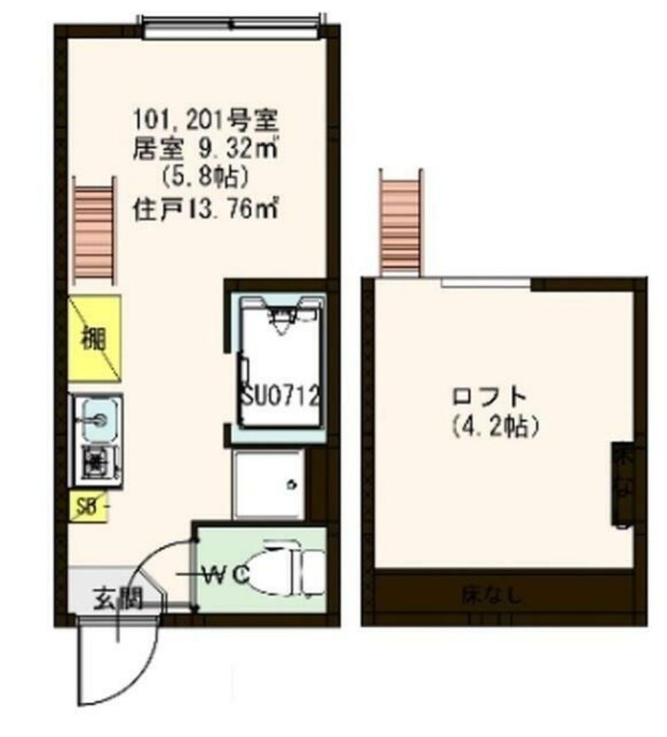 | 室内設備 | 冷房、暖房、エアコン、ロフト、洗濯機置場、冷蔵庫、フローリング、照明器具、室内洗濯機置き場 |