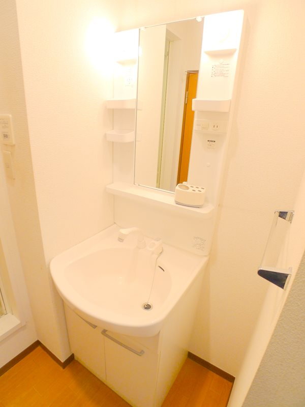 壁面にミラー・収納棚あり。